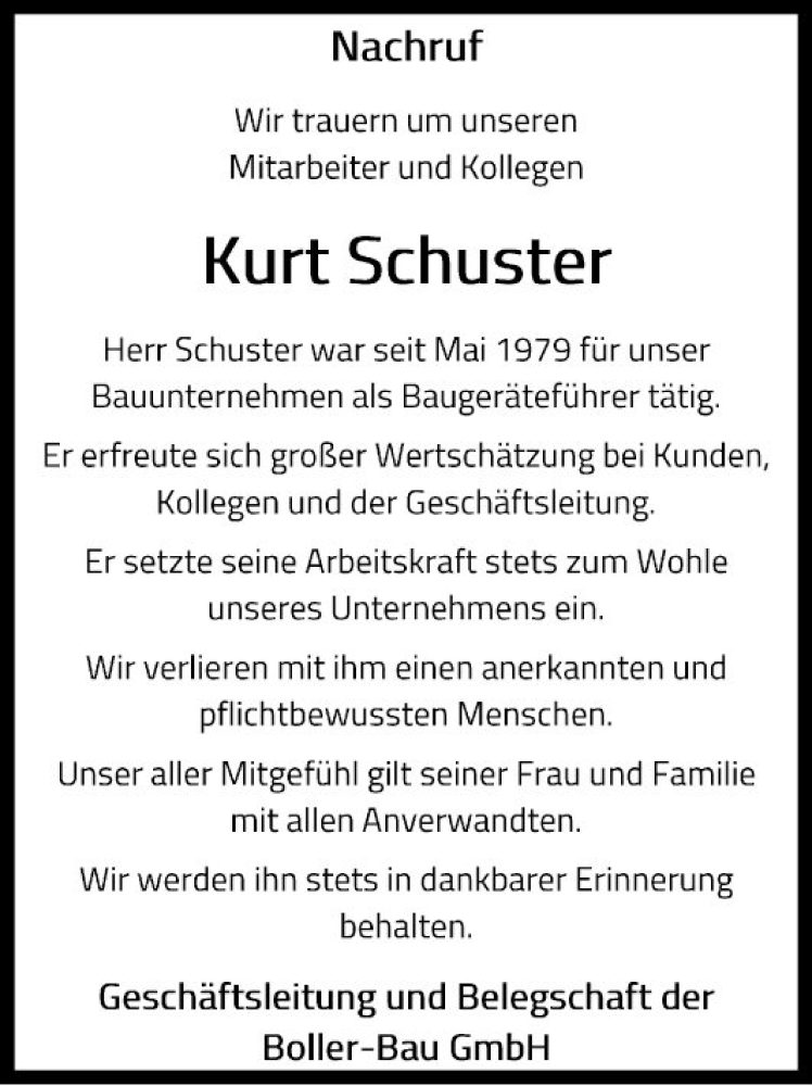 Hier finden Sie alle Traueranzeigen aus der Zeitung, die bisher für Kurt Schuster erschienen sind. Weitere Traueranzeigen, die in der Zeitung erscheinen, werden hier ebenfalls aufgelistet