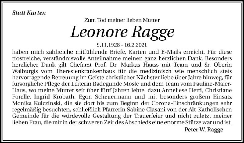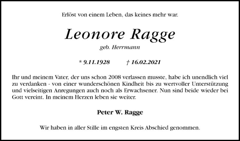 Hier finden Sie alle Traueranzeigen aus der Zeitung, die bisher für Leonore Ragge erschienen sind. Weitere Traueranzeigen, die in der Zeitung erscheinen, werden hier ebenfalls aufgelistet