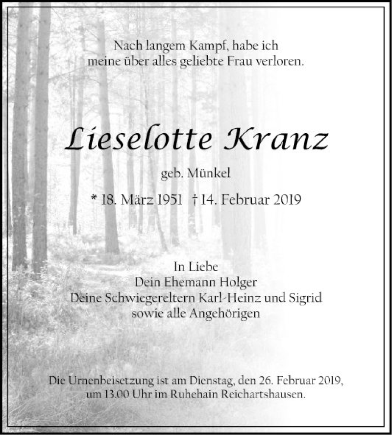 Hier finden Sie alle Traueranzeigen aus der Zeitung, die bisher für Lieselotte Kranz erschienen sind. Weitere Traueranzeigen, die in der Zeitung erscheinen, werden hier ebenfalls aufgelistet