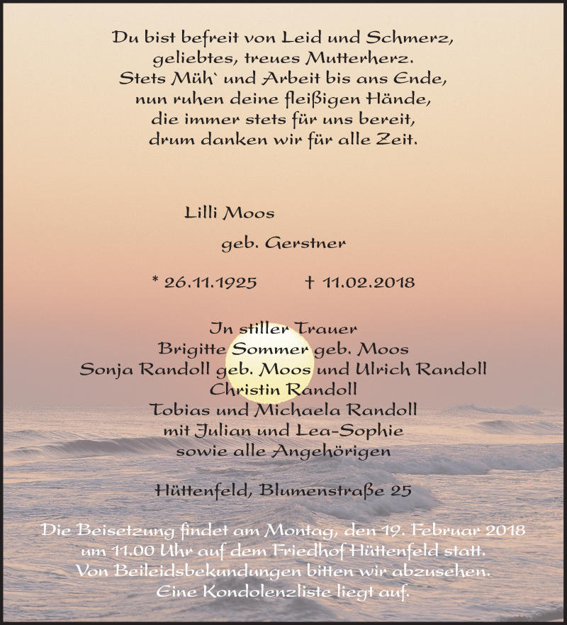 Hier finden Sie alle Traueranzeigen aus der Zeitung, die bisher für Lilli Moos erschienen sind. Weitere Traueranzeigen, die in der Zeitung erscheinen, werden hier ebenfalls aufgelistet