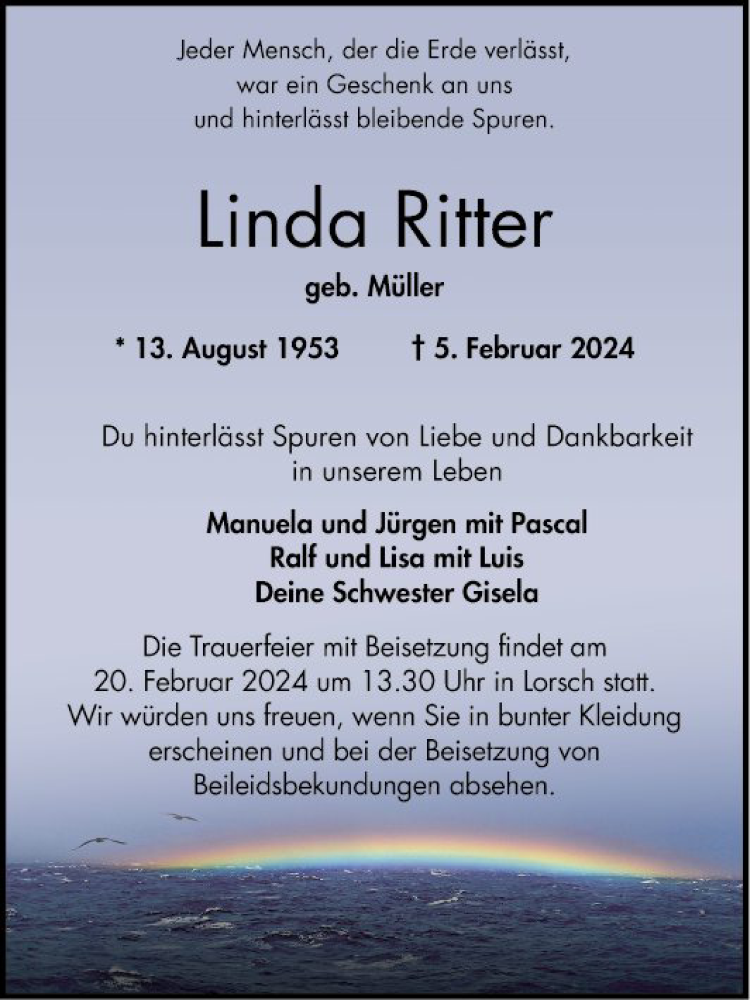 Hier finden Sie alle Traueranzeigen aus der Zeitung, die bisher für Linda Ritter erschienen sind. Weitere Traueranzeigen, die in der Zeitung erscheinen, werden hier ebenfalls aufgelistet