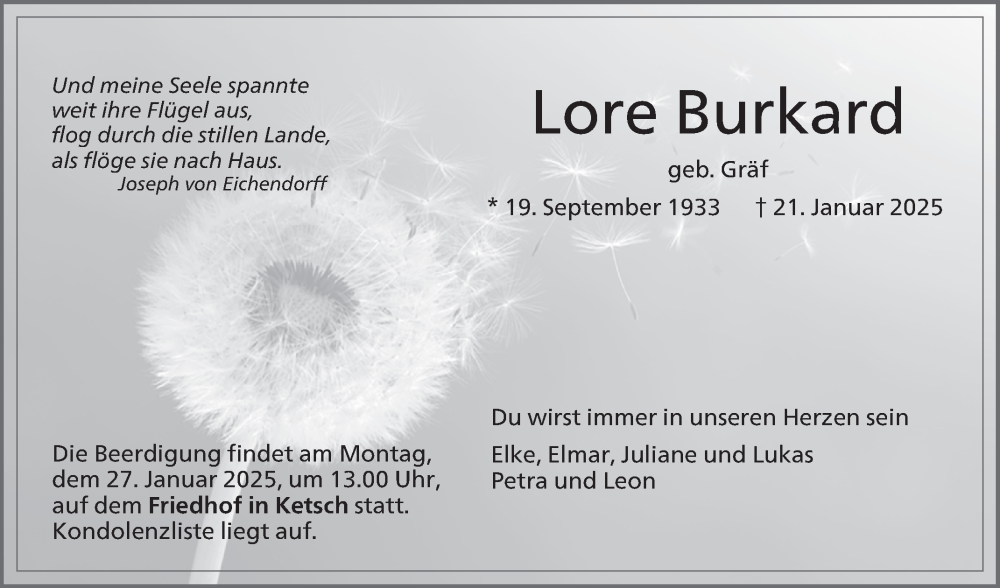 Hier finden Sie alle Traueranzeigen aus der Zeitung, die bisher für Lore Burkard erschienen sind. Weitere Traueranzeigen, die in der Zeitung erscheinen, werden hier ebenfalls aufgelistet
