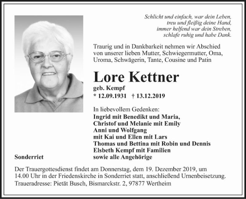 Hier finden Sie alle Traueranzeigen aus der Zeitung, die bisher für Lore Kettner erschienen sind. Weitere Traueranzeigen, die in der Zeitung erscheinen, werden hier ebenfalls aufgelistet