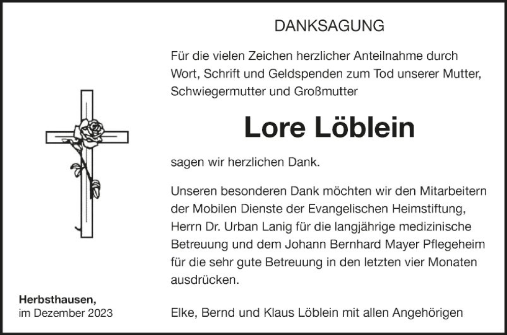 Hier finden Sie alle Traueranzeigen aus der Zeitung, die bisher für Lore Löblein erschienen sind. Weitere Traueranzeigen, die in der Zeitung erscheinen, werden hier ebenfalls aufgelistet
