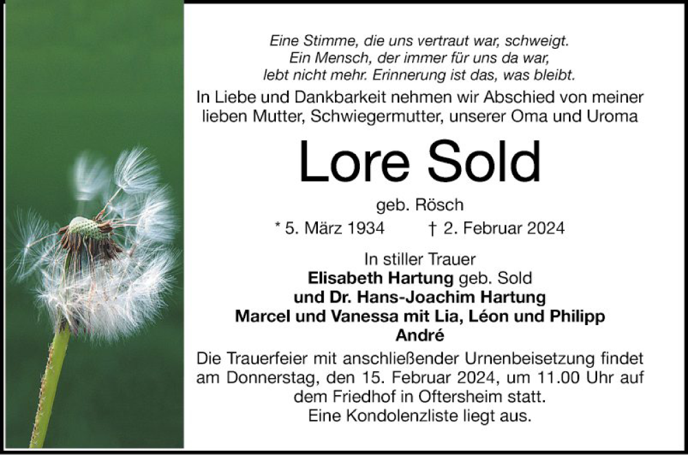 Hier finden Sie alle Traueranzeigen aus der Zeitung, die bisher für Lore Sold erschienen sind. Weitere Traueranzeigen, die in der Zeitung erscheinen, werden hier ebenfalls aufgelistet
