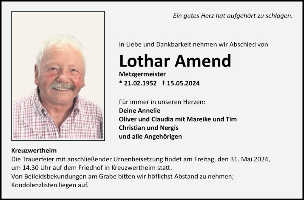Hier finden Sie alle Traueranzeigen aus der Zeitung, die bisher für Lothar Amend erschienen sind. Weitere Traueranzeigen, die in der Zeitung erscheinen, werden hier ebenfalls aufgelistet