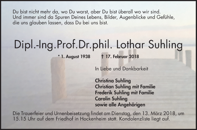 Hier finden Sie alle Traueranzeigen aus der Zeitung, die bisher für Lothar Suhling erschienen sind. Weitere Traueranzeigen, die in der Zeitung erscheinen, werden hier ebenfalls aufgelistet