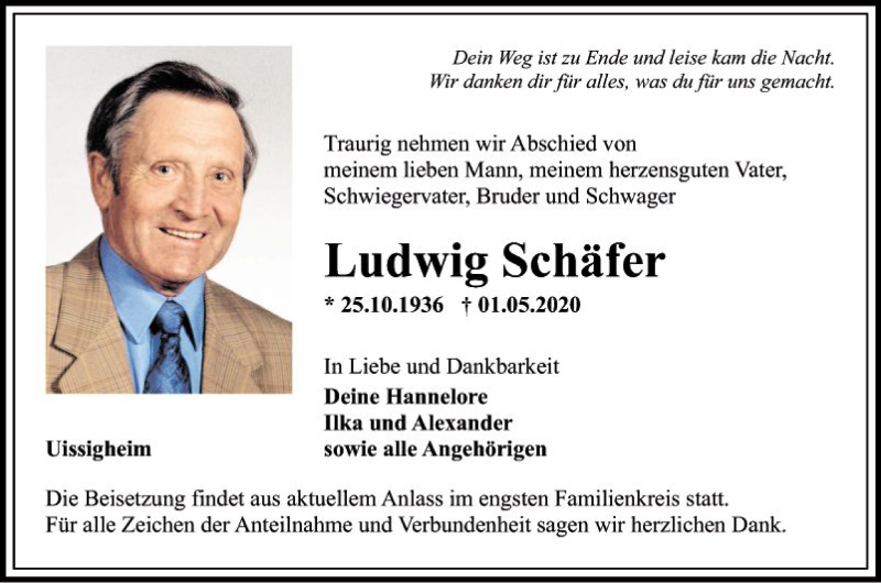 Hier finden Sie alle Traueranzeigen aus der Zeitung, die bisher für Ludwig Schäfer erschienen sind. Weitere Traueranzeigen, die in der Zeitung erscheinen, werden hier ebenfalls aufgelistet