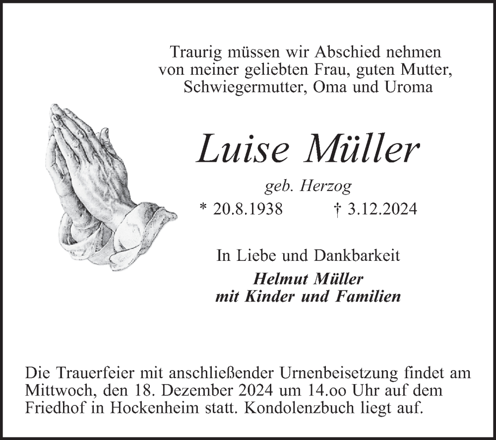 Hier finden Sie alle Traueranzeigen aus der Zeitung, die bisher für Luise Müller erschienen sind. Weitere Traueranzeigen, die in der Zeitung erscheinen, werden hier ebenfalls aufgelistet