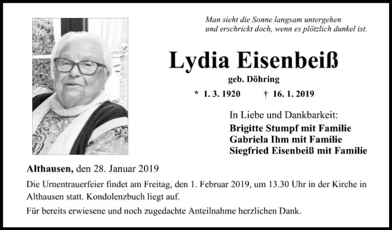 Hier finden Sie alle Traueranzeigen aus der Zeitung, die bisher für Lydia Eisenbeiß erschienen sind. Weitere Traueranzeigen, die in der Zeitung erscheinen, werden hier ebenfalls aufgelistet