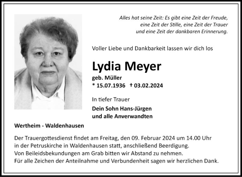 Hier finden Sie alle Traueranzeigen aus der Zeitung, die bisher für Lydia Meyer erschienen sind. Weitere Traueranzeigen, die in der Zeitung erscheinen, werden hier ebenfalls aufgelistet