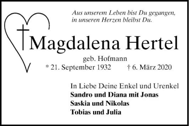 Hier finden Sie alle Traueranzeigen aus der Zeitung, die bisher für Magdalena Hertel erschienen sind. Weitere Traueranzeigen, die in der Zeitung erscheinen, werden hier ebenfalls aufgelistet