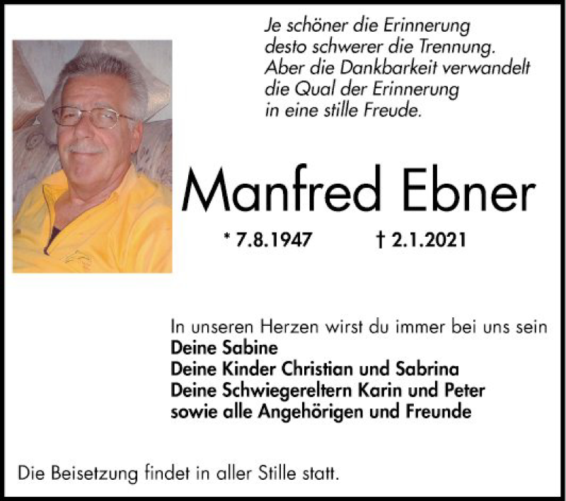 Hier finden Sie alle Traueranzeigen aus der Zeitung, die bisher für Manfred Ebner erschienen sind. Weitere Traueranzeigen, die in der Zeitung erscheinen, werden hier ebenfalls aufgelistet