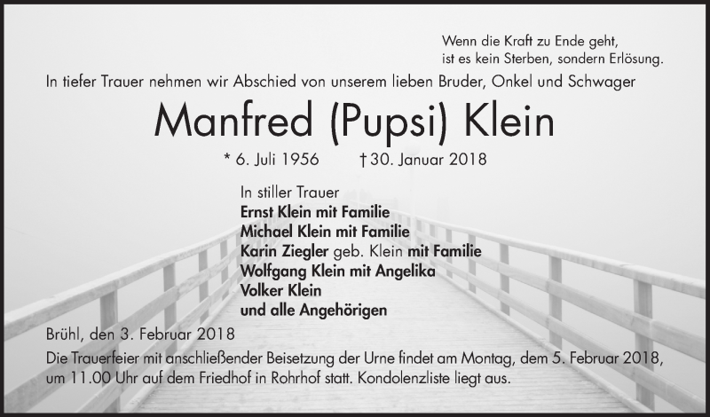 Hier finden Sie alle Traueranzeigen aus der Zeitung, die bisher für Manfred Klein erschienen sind. Weitere Traueranzeigen, die in der Zeitung erscheinen, werden hier ebenfalls aufgelistet