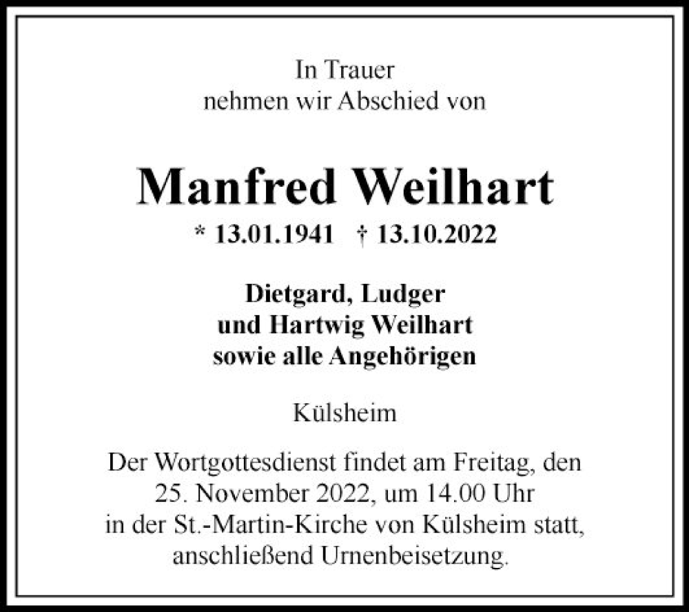 Hier finden Sie alle Traueranzeigen aus der Zeitung, die bisher für Manfred Weilhart erschienen sind. Weitere Traueranzeigen, die in der Zeitung erscheinen, werden hier ebenfalls aufgelistet