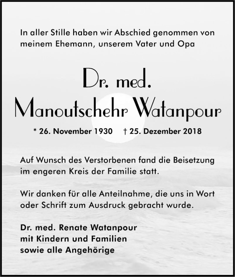 Hier finden Sie alle Traueranzeigen aus der Zeitung, die bisher für Manoutschehr Watanpour erschienen sind. Weitere Traueranzeigen, die in der Zeitung erscheinen, werden hier ebenfalls aufgelistet