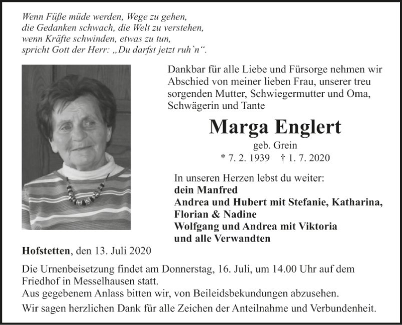 Hier finden Sie alle Traueranzeigen aus der Zeitung, die bisher für Marga Englert erschienen sind. Weitere Traueranzeigen, die in der Zeitung erscheinen, werden hier ebenfalls aufgelistet