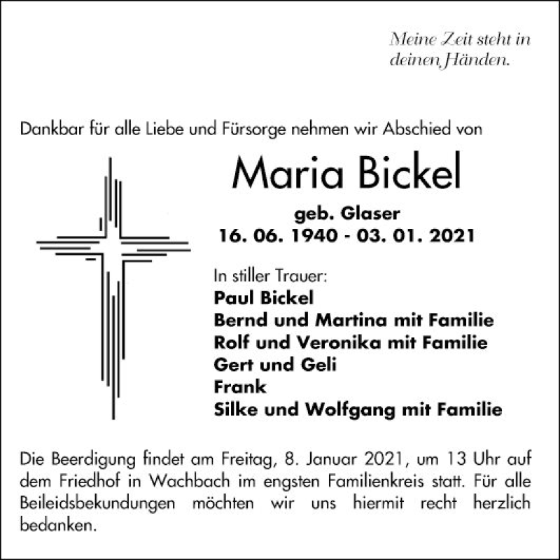 Hier finden Sie alle Traueranzeigen aus der Zeitung, die bisher für Maria Bickel erschienen sind. Weitere Traueranzeigen, die in der Zeitung erscheinen, werden hier ebenfalls aufgelistet