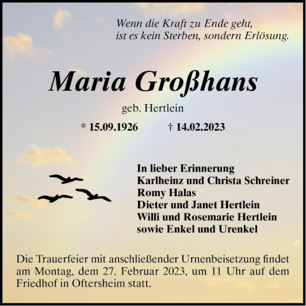 Hier finden Sie alle Traueranzeigen aus der Zeitung, die bisher für Maria Großhans erschienen sind. Weitere Traueranzeigen, die in der Zeitung erscheinen, werden hier ebenfalls aufgelistet