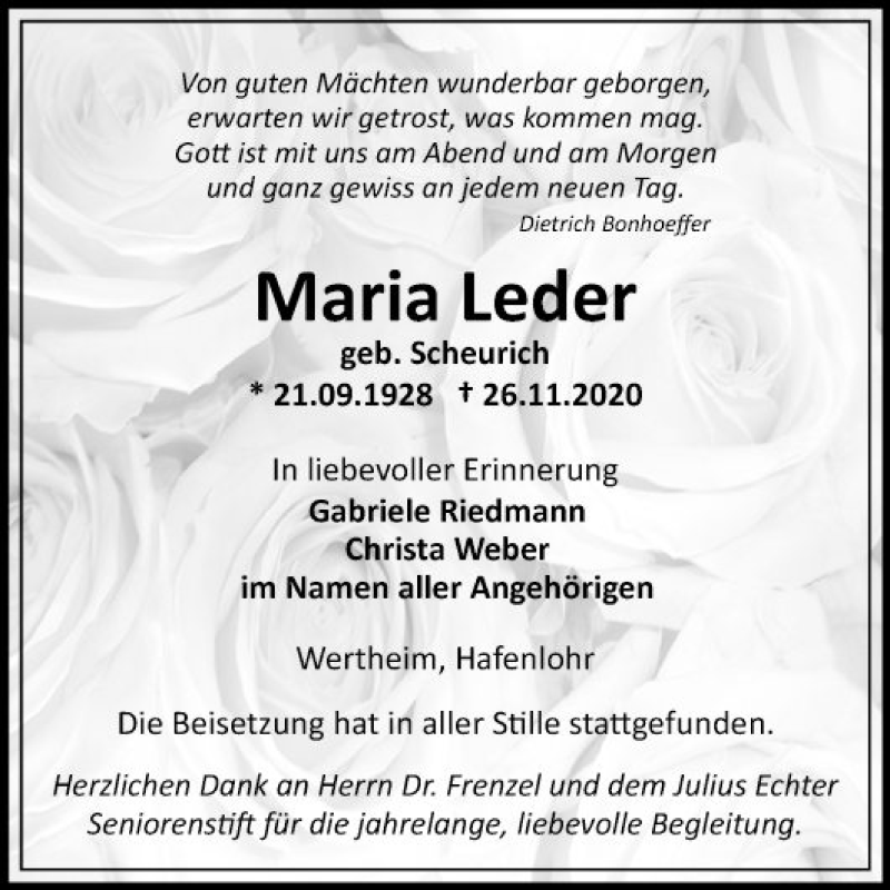 Hier finden Sie alle Traueranzeigen aus der Zeitung, die bisher für Maria Leder erschienen sind. Weitere Traueranzeigen, die in der Zeitung erscheinen, werden hier ebenfalls aufgelistet
