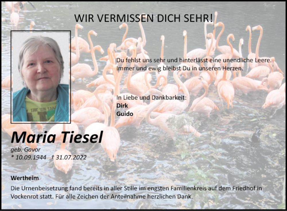 Hier finden Sie alle Traueranzeigen aus der Zeitung, die bisher für Maria Tiesel erschienen sind. Weitere Traueranzeigen, die in der Zeitung erscheinen, werden hier ebenfalls aufgelistet