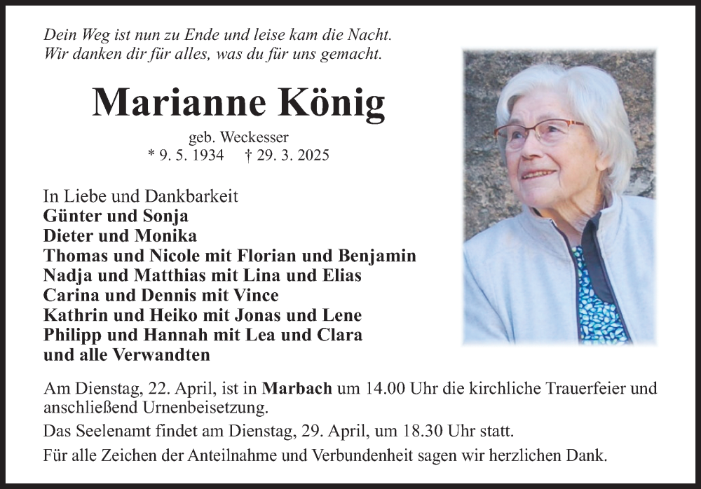 Hier finden Sie alle Traueranzeigen aus der Zeitung, die bisher für Marianne König erschienen sind. Weitere Traueranzeigen, die in der Zeitung erscheinen, werden hier ebenfalls aufgelistet