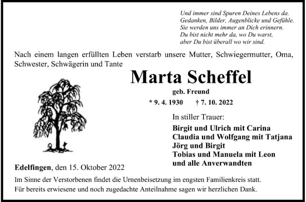 Hier finden Sie alle Traueranzeigen aus der Zeitung, die bisher für Marta Scheffel erschienen sind. Weitere Traueranzeigen, die in der Zeitung erscheinen, werden hier ebenfalls aufgelistet