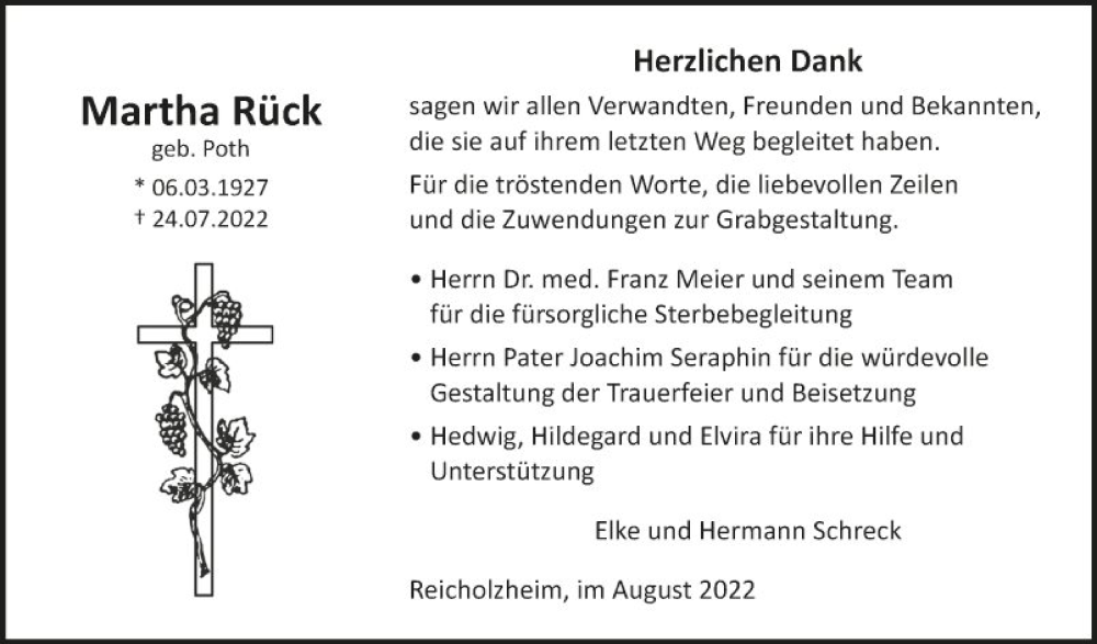 Hier finden Sie alle Traueranzeigen aus der Zeitung, die bisher für Martha Rück erschienen sind. Weitere Traueranzeigen, die in der Zeitung erscheinen, werden hier ebenfalls aufgelistet