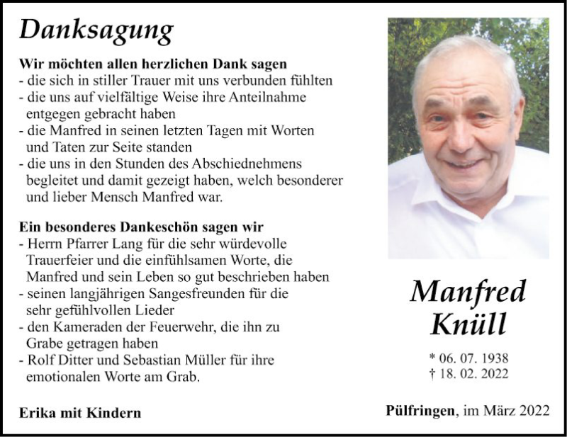 Hier finden Sie alle Traueranzeigen aus der Zeitung, die bisher für Martin Knüll erschienen sind. Weitere Traueranzeigen, die in der Zeitung erscheinen, werden hier ebenfalls aufgelistet