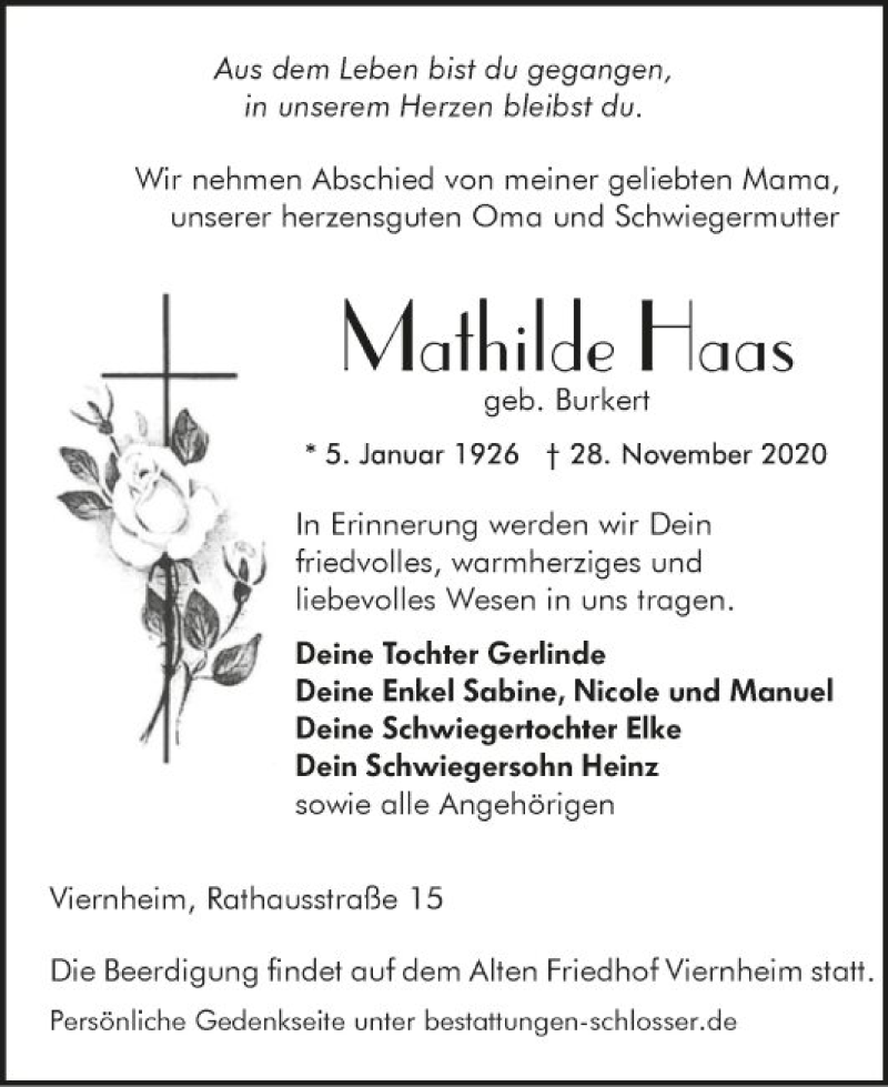 Hier finden Sie alle Traueranzeigen aus der Zeitung, die bisher für Mathilde Haas erschienen sind. Weitere Traueranzeigen, die in der Zeitung erscheinen, werden hier ebenfalls aufgelistet