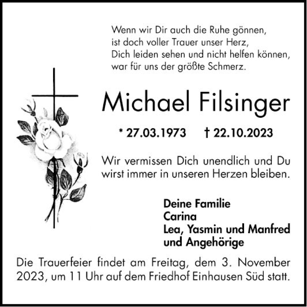 Hier finden Sie alle Traueranzeigen aus der Zeitung, die bisher für Michael Filsinger erschienen sind. Weitere Traueranzeigen, die in der Zeitung erscheinen, werden hier ebenfalls aufgelistet