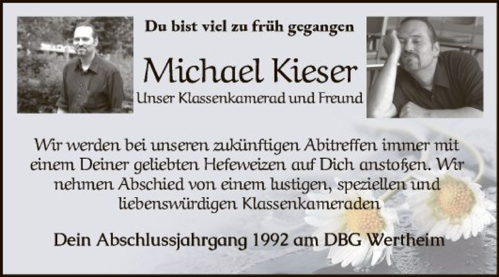 Hier finden Sie alle Traueranzeigen aus der Zeitung, die bisher für Michael Kieser erschienen sind. Weitere Traueranzeigen, die in der Zeitung erscheinen, werden hier ebenfalls aufgelistet