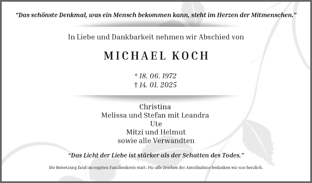 Hier finden Sie alle Traueranzeigen aus der Zeitung, die bisher für Michael Koch erschienen sind. Weitere Traueranzeigen, die in der Zeitung erscheinen, werden hier ebenfalls aufgelistet