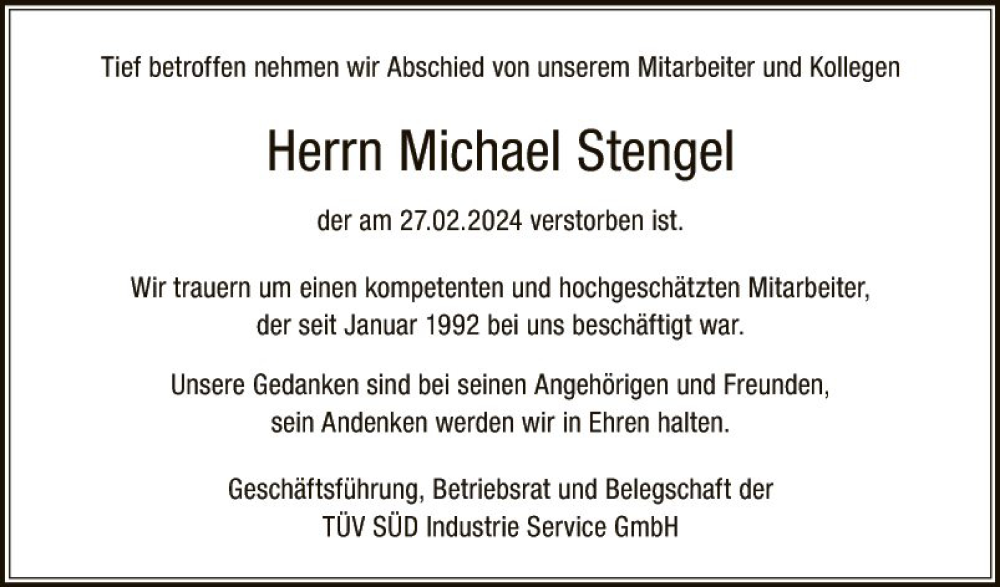 Hier finden Sie alle Traueranzeigen aus der Zeitung, die bisher für Michael Stengel erschienen sind. Weitere Traueranzeigen, die in der Zeitung erscheinen, werden hier ebenfalls aufgelistet