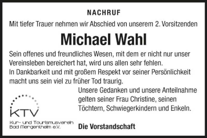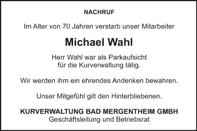 Hier finden Sie alle Traueranzeigen aus der Zeitung, die bisher für Michael Wahl erschienen sind. Weitere Traueranzeigen, die in der Zeitung erscheinen, werden hier ebenfalls aufgelistet