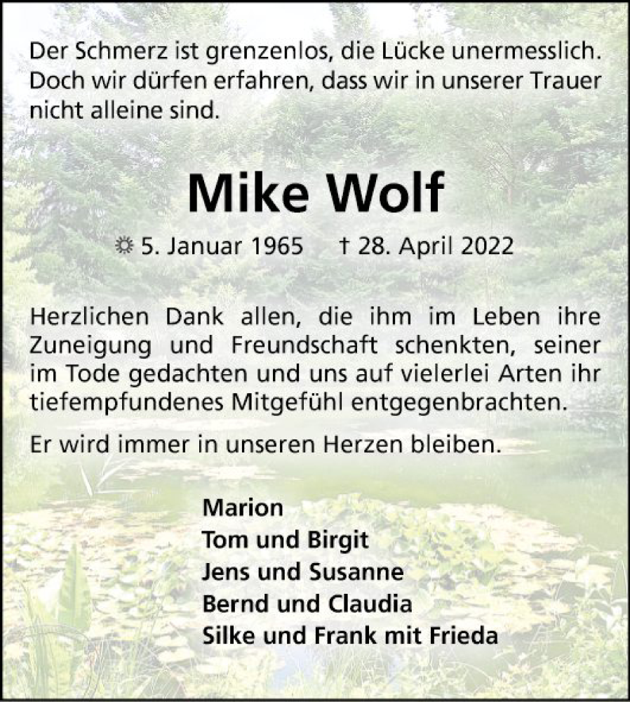 Hier finden Sie alle Traueranzeigen aus der Zeitung, die bisher für Mike Wolf erschienen sind. Weitere Traueranzeigen, die in der Zeitung erscheinen, werden hier ebenfalls aufgelistet