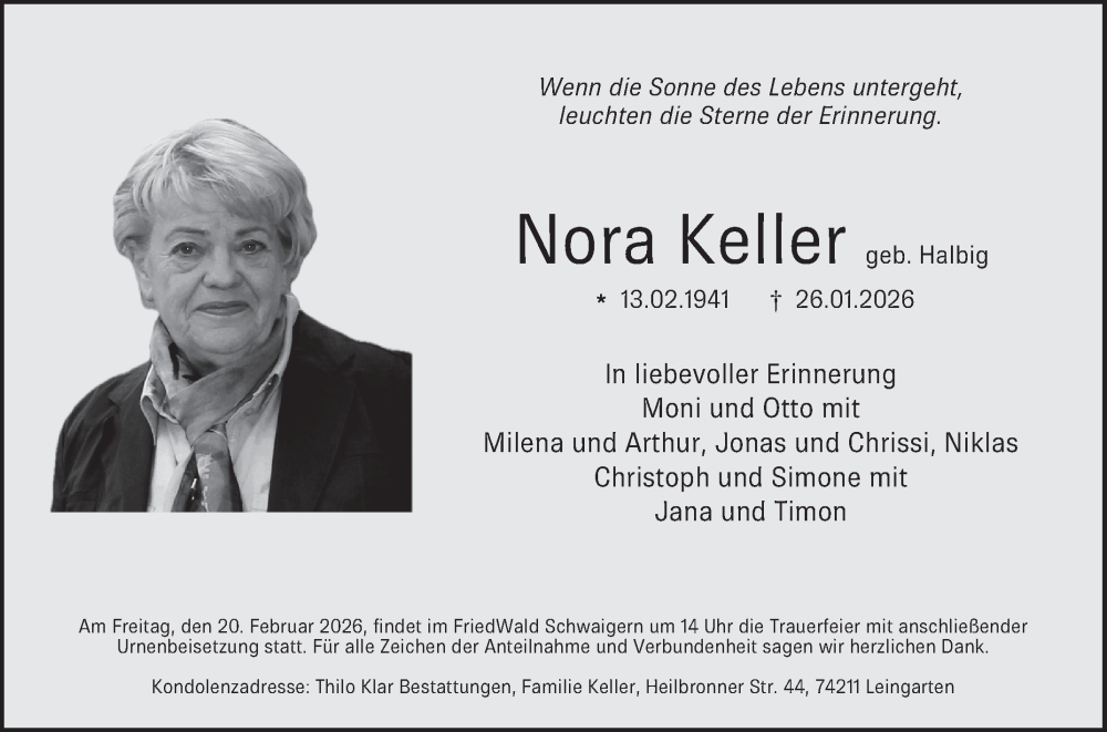 Hier finden Sie alle Traueranzeigen aus der Zeitung, die bisher für Nora Keller erschienen sind. Weitere Traueranzeigen, die in der Zeitung erscheinen, werden hier ebenfalls aufgelistet