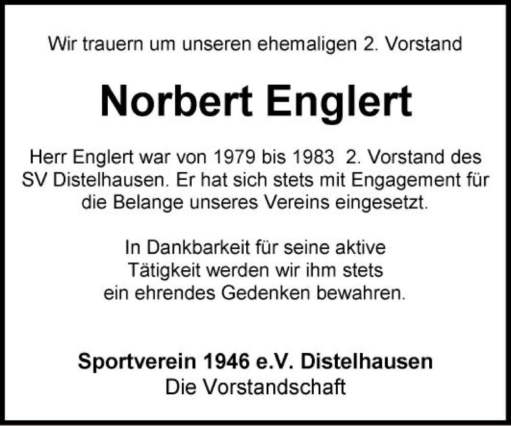 Hier finden Sie alle Traueranzeigen aus der Zeitung, die bisher für Norbert Englert erschienen sind. Weitere Traueranzeigen, die in der Zeitung erscheinen, werden hier ebenfalls aufgelistet