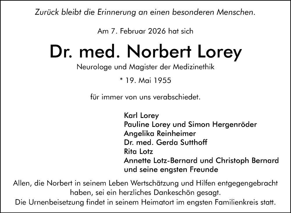 Hier finden Sie alle Traueranzeigen aus der Zeitung, die bisher für Norbert Lorey erschienen sind. Weitere Traueranzeigen, die in der Zeitung erscheinen, werden hier ebenfalls aufgelistet