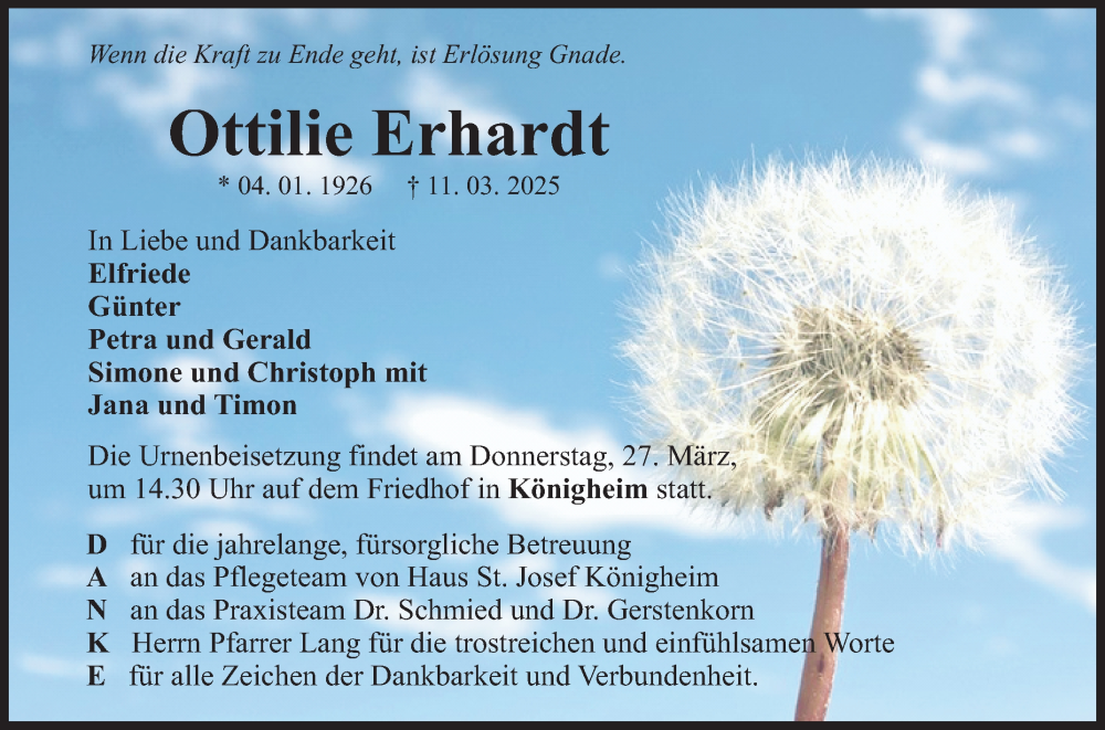 Hier finden Sie alle Traueranzeigen aus der Zeitung, die bisher für Ottilie Erhardt erschienen sind. Weitere Traueranzeigen, die in der Zeitung erscheinen, werden hier ebenfalls aufgelistet