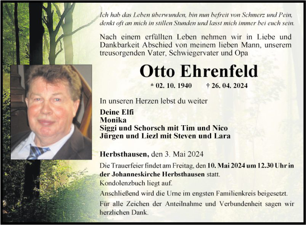 Hier finden Sie alle Traueranzeigen aus der Zeitung, die bisher für Otto Ehrenfeld erschienen sind. Weitere Traueranzeigen, die in der Zeitung erscheinen, werden hier ebenfalls aufgelistet
