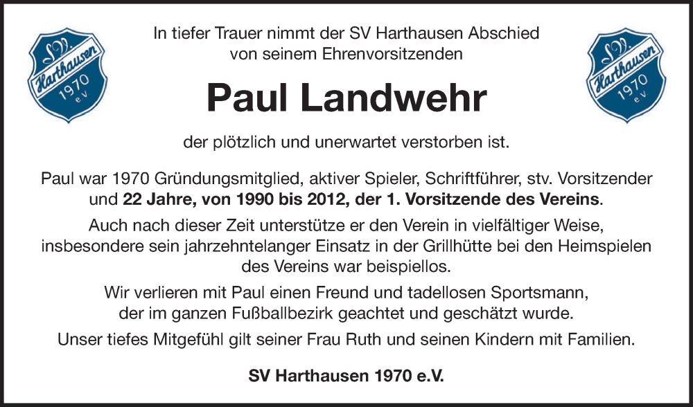 Hier finden Sie alle Traueranzeigen aus der Zeitung, die bisher für Paul Landwehr erschienen sind. Weitere Traueranzeigen, die in der Zeitung erscheinen, werden hier ebenfalls aufgelistet