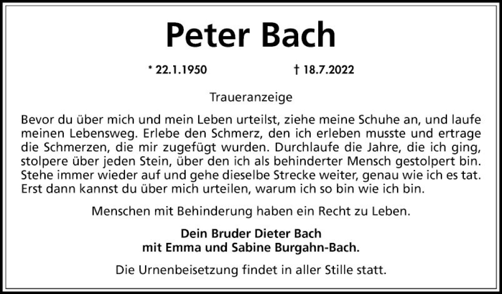 Hier finden Sie alle Traueranzeigen aus der Zeitung, die bisher für Peter Bach erschienen sind. Weitere Traueranzeigen, die in der Zeitung erscheinen, werden hier ebenfalls aufgelistet