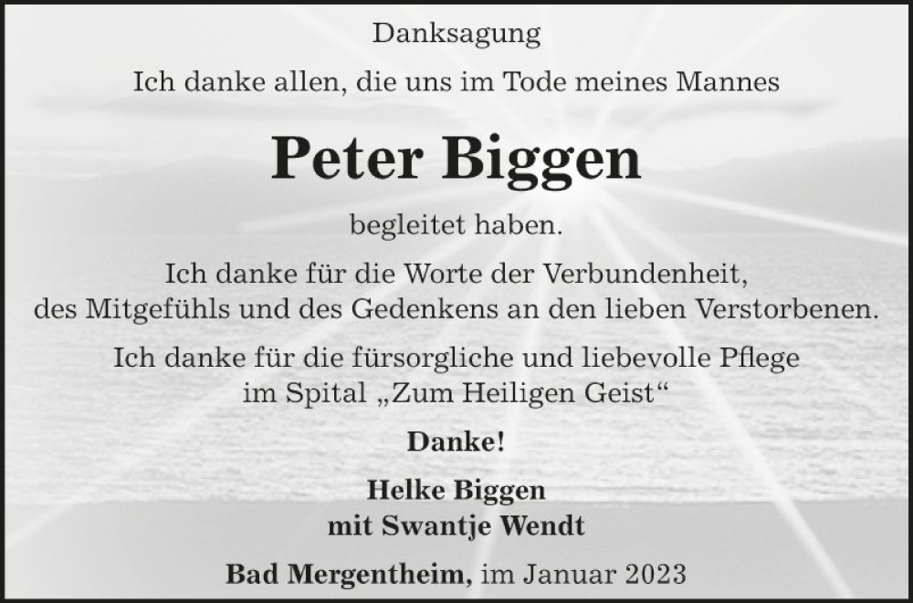 Hier finden Sie alle Traueranzeigen aus der Zeitung, die bisher für Peter Biggen erschienen sind. Weitere Traueranzeigen, die in der Zeitung erscheinen, werden hier ebenfalls aufgelistet