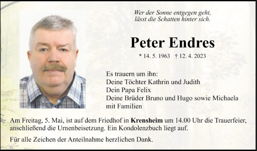 Hier finden Sie alle Traueranzeigen aus der Zeitung, die bisher für Peter Endres erschienen sind. Weitere Traueranzeigen, die in der Zeitung erscheinen, werden hier ebenfalls aufgelistet