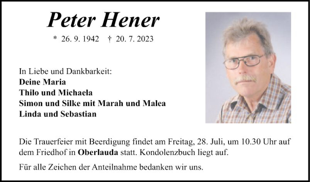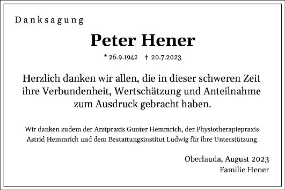 Hier finden Sie alle Traueranzeigen aus der Zeitung, die bisher für Peter Hener erschienen sind. Weitere Traueranzeigen, die in der Zeitung erscheinen, werden hier ebenfalls aufgelistet