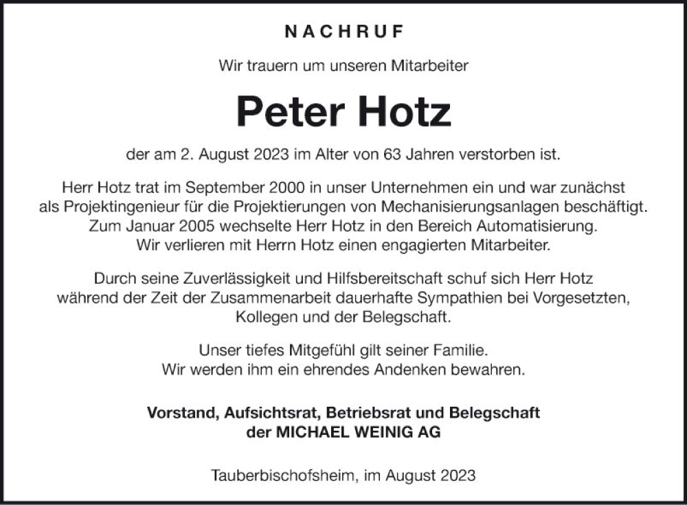 Hier finden Sie alle Traueranzeigen aus der Zeitung, die bisher für Peter Hotz erschienen sind. Weitere Traueranzeigen, die in der Zeitung erscheinen, werden hier ebenfalls aufgelistet