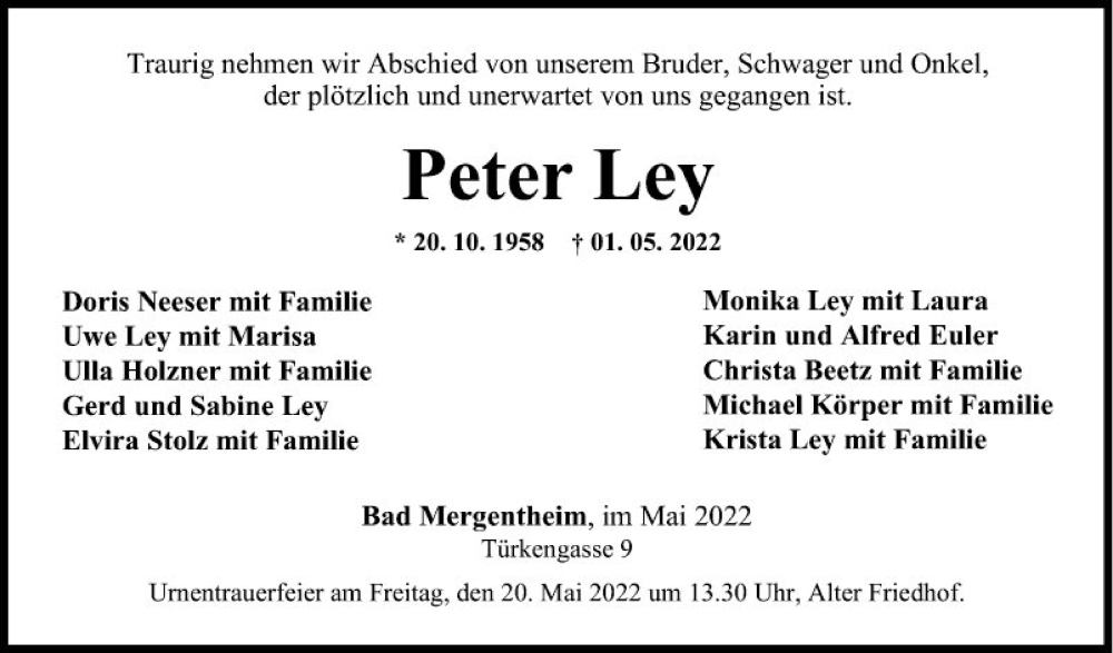 Hier finden Sie alle Traueranzeigen aus der Zeitung, die bisher für Peter Ley erschienen sind. Weitere Traueranzeigen, die in der Zeitung erscheinen, werden hier ebenfalls aufgelistet