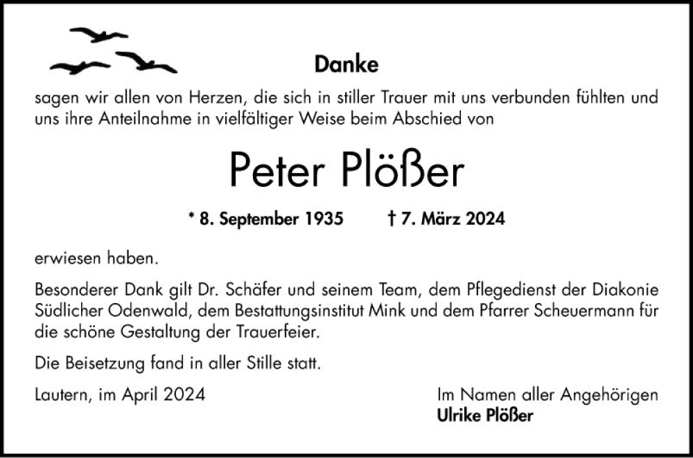 Hier finden Sie alle Traueranzeigen aus der Zeitung, die bisher für Peter Plößer erschienen sind. Weitere Traueranzeigen, die in der Zeitung erscheinen, werden hier ebenfalls aufgelistet