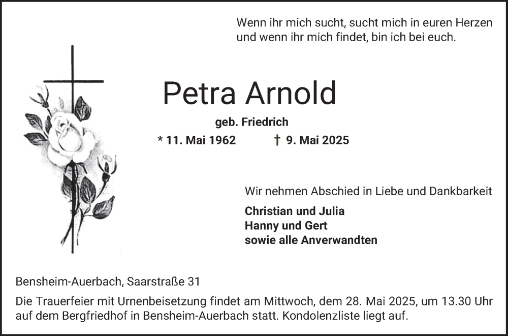 Hier finden Sie alle Traueranzeigen aus der Zeitung, die bisher für Petra Arnold erschienen sind. Weitere Traueranzeigen, die in der Zeitung erscheinen, werden hier ebenfalls aufgelistet